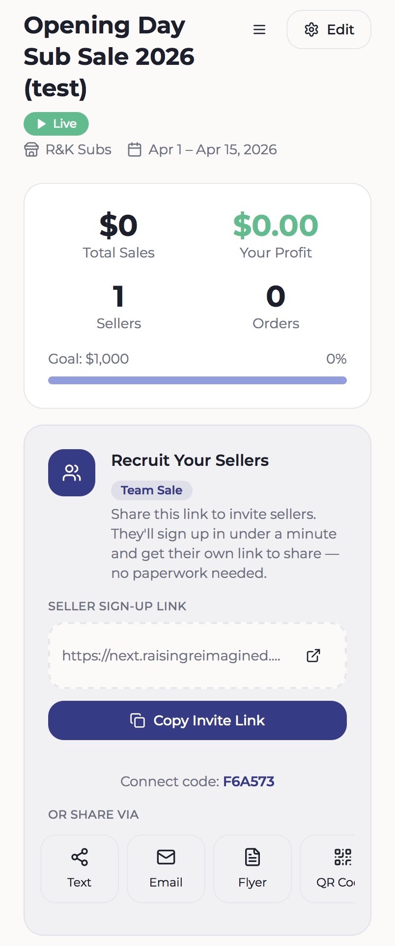 - ✓Real-time dashboard shows total raised, seller rankings, and progress toward your goal